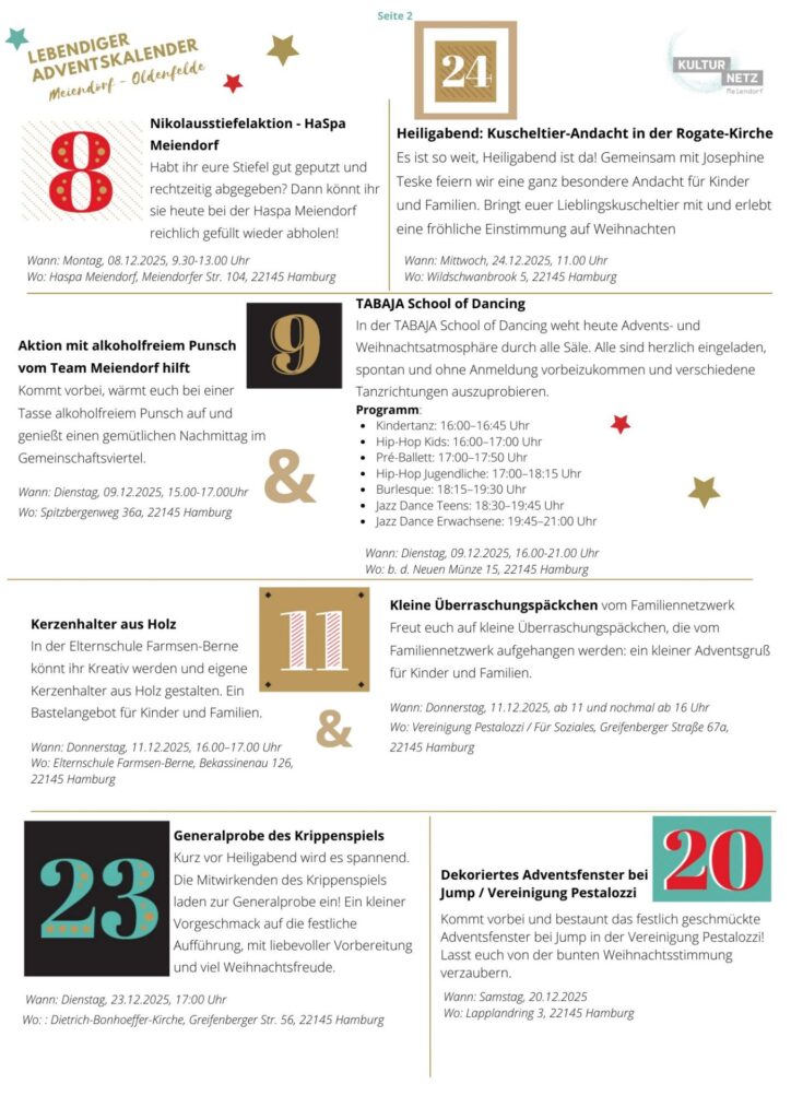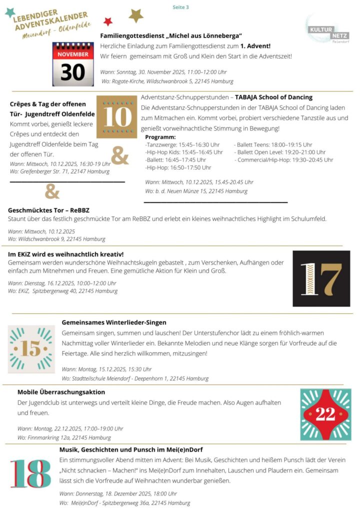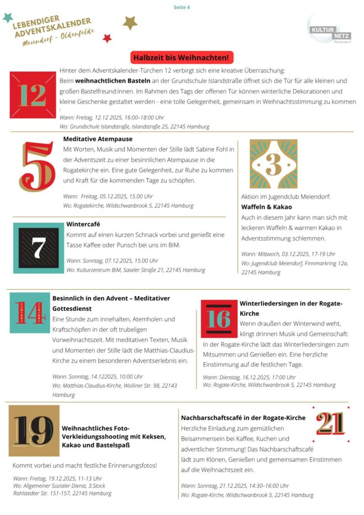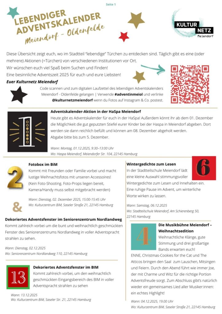 Auch 2025 sind wieder viele Institutionen aus Meiendorf-Oldenfelde dabei und öffnen im Advent ihre Türchen für euch. Mitmach-Aktionen, Konzerte, Ruhepausen oder geschmückte Fenster laden ein, den Stadtteil neu zu entdecken und die vorweihnachtliche Stimmung gemeinsam mit der Nachbarschaft zu genießen.